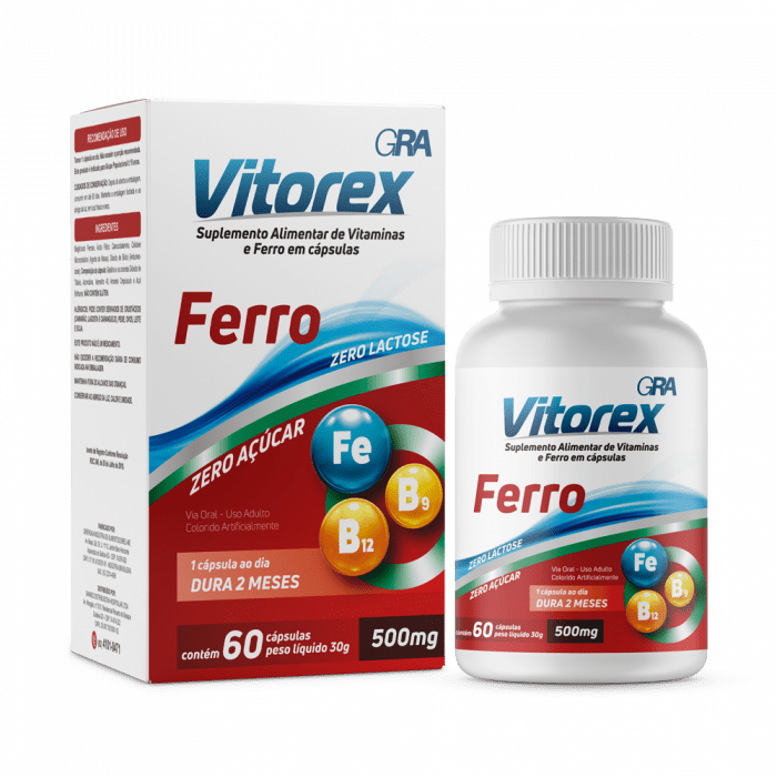 - Vitorex Ferro com 60 cápsulas: Combina ferro com vitaminas B9 e B12, essenciais para a saúde sanguínea e geral do organismo.